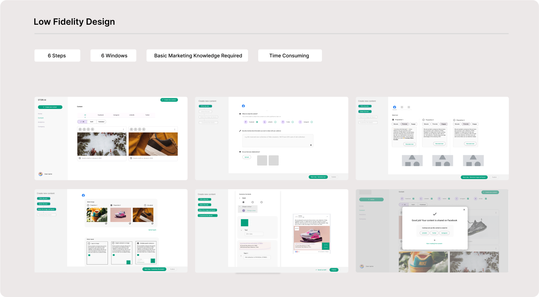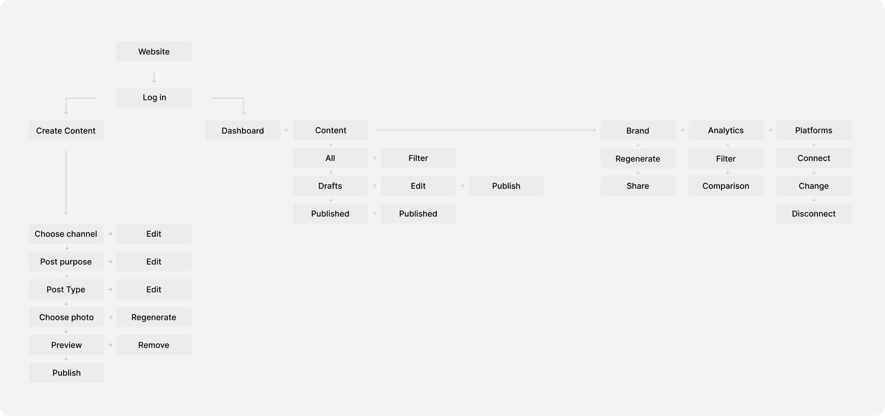 Despite the extensive discussions and iterative updates throughout the project, the core structure and flow of the initial Story Map remained largely unchanged. We made minor adjustments and refinements, but the overall roadmap remained consistent and provided a solid foundation for our work. (We removed certain details from the "Brand info" section, such as tone of voice and audience, because we assumed that our customers might not be very familiar with those terms. In order to simplify the process for them, we made the decision to let AI determine these aspects instead. Hereby I am showcasing the story map of a registered user.