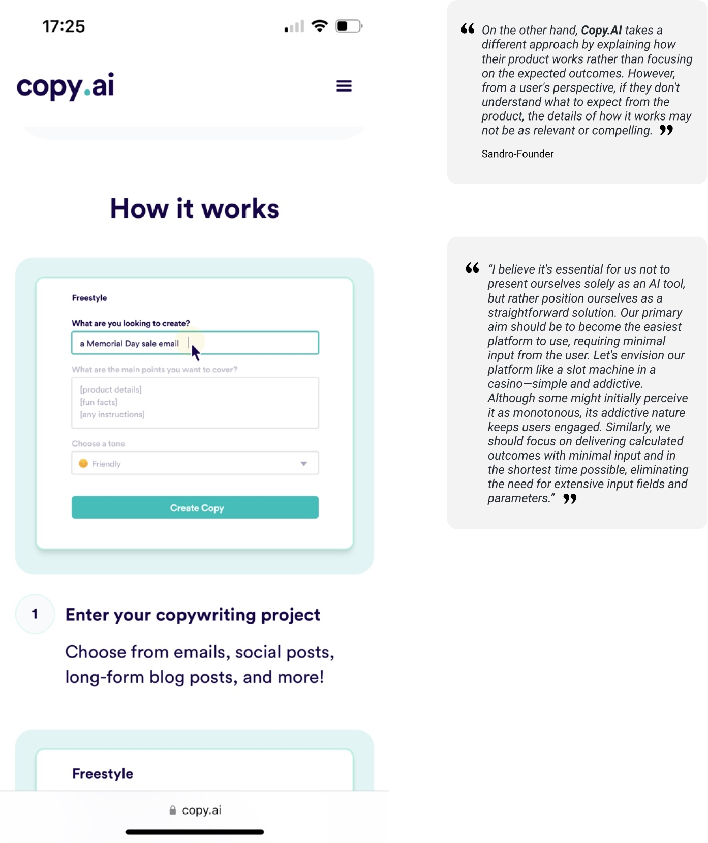 It turns out that we prioritize a mobile-first approach. Our users are not inclined to read lengthy content, so we aim to create a visually engaging experience that quickly captures their attention and conveys information efficiently. As for the examples provided, such as https://www.jasper.ai/, https://www.copy.ai/, and https://www.copyshark.ai/, we found them to be overwhelming with excessive information and text on their homepages, which does not align with our user's preferences.